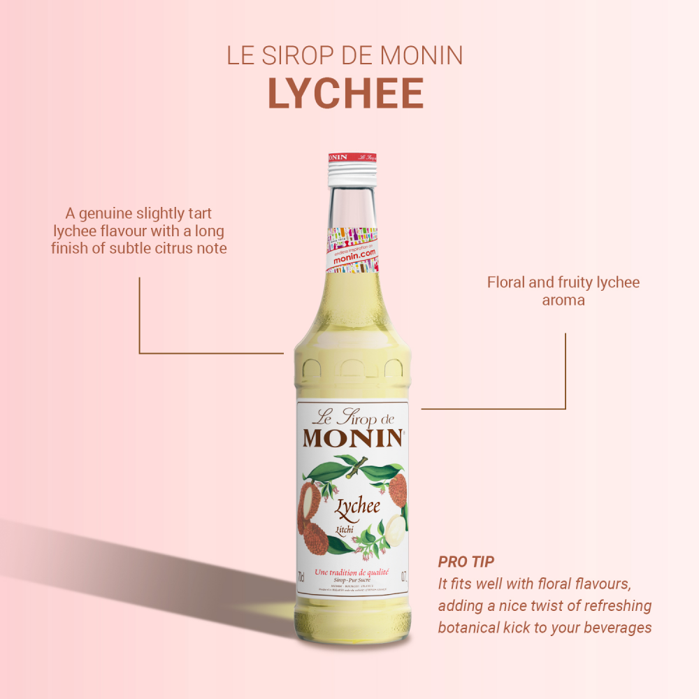 With Monin Lychee Syrup. you can unlock a world of creativity and craft a range of delightful beverages. from lychee martinis and tropical mocktails to lychee-infused lemonades and fruit punches. Its authentic flavour and fruity aroma will captivate your customers. offering them a refreshing and delightful experience.