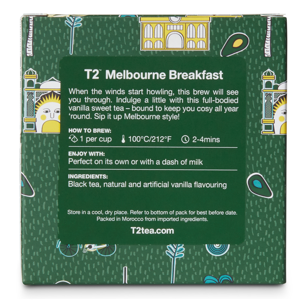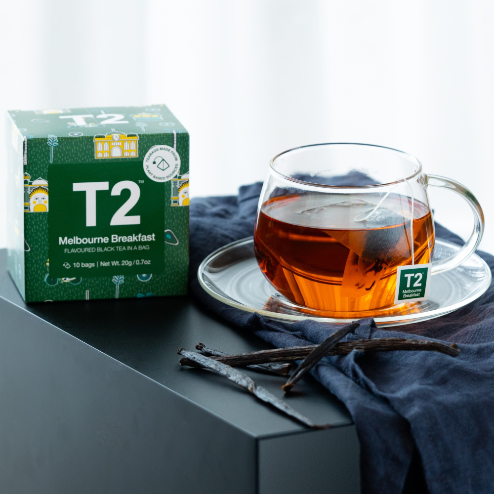 Indulge and sip a smooth blend of bold. malty black tea and rich velvety vanilla. with T2 Melbourne Breakfast.